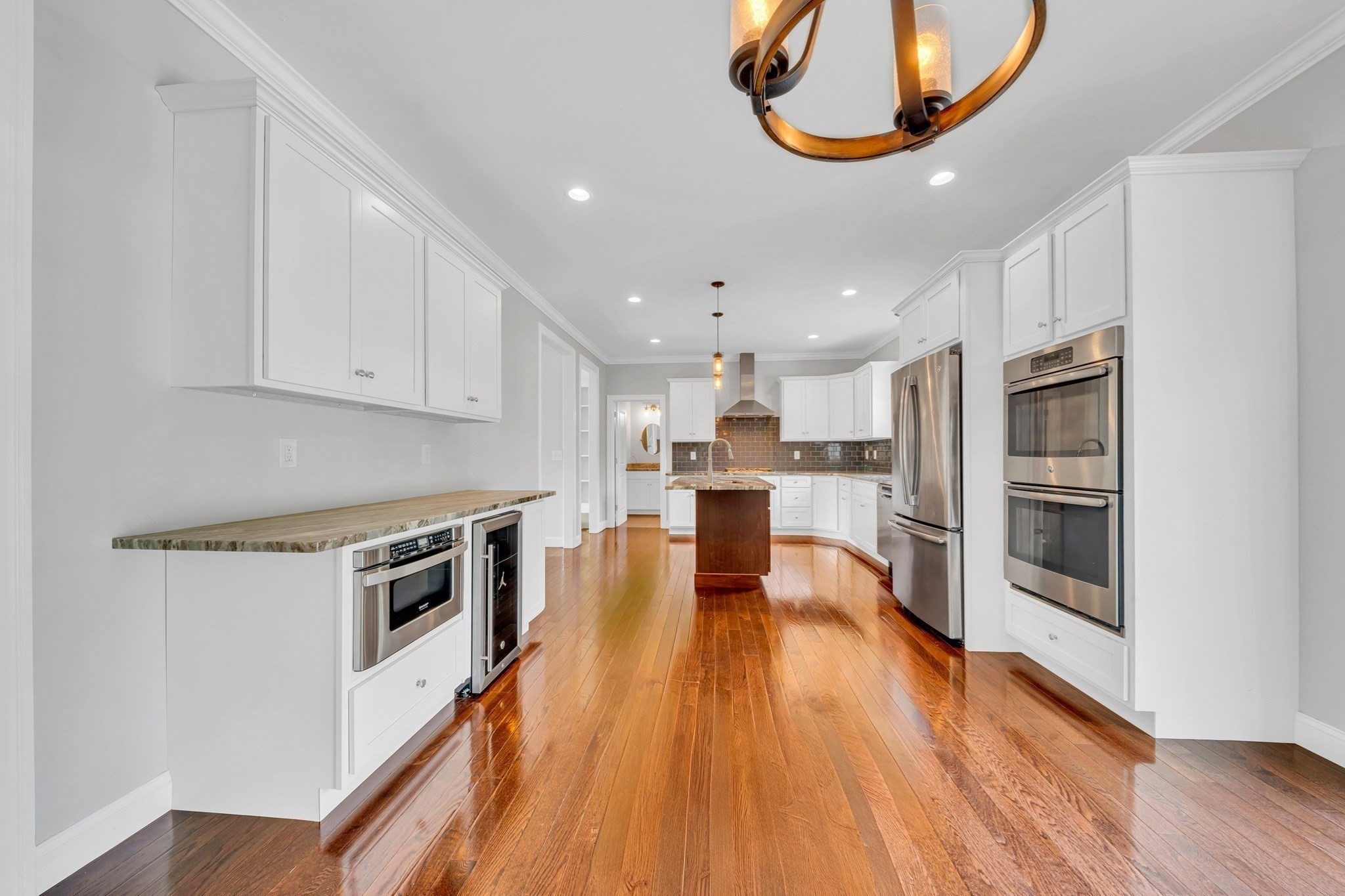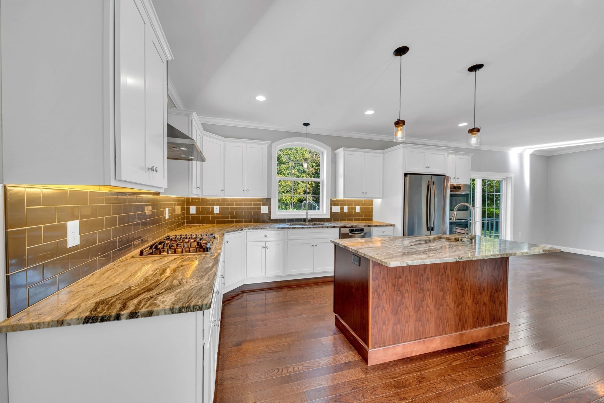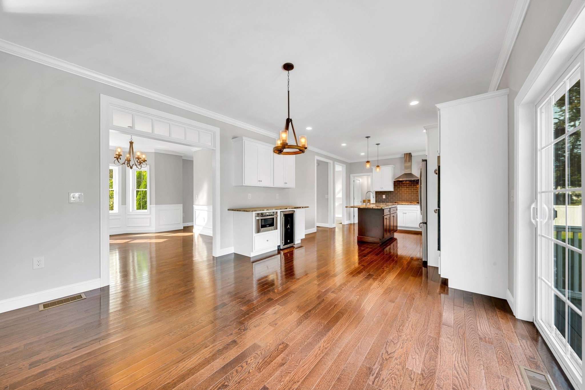 - Cabinets - Upgraded, Countertops - Stone/Granite/Solid, Countertops - Upgraded, Crown Molding, Deck - Exterior, Dining Area, Exterior Access, Flooring - Hardwood, Kitchen Island, Lighting - Pendant, Open Floor Plan, Recessed Lighting, Slider, Stainless Steel Appliances, Window(s) - Picture, Wine Chiller