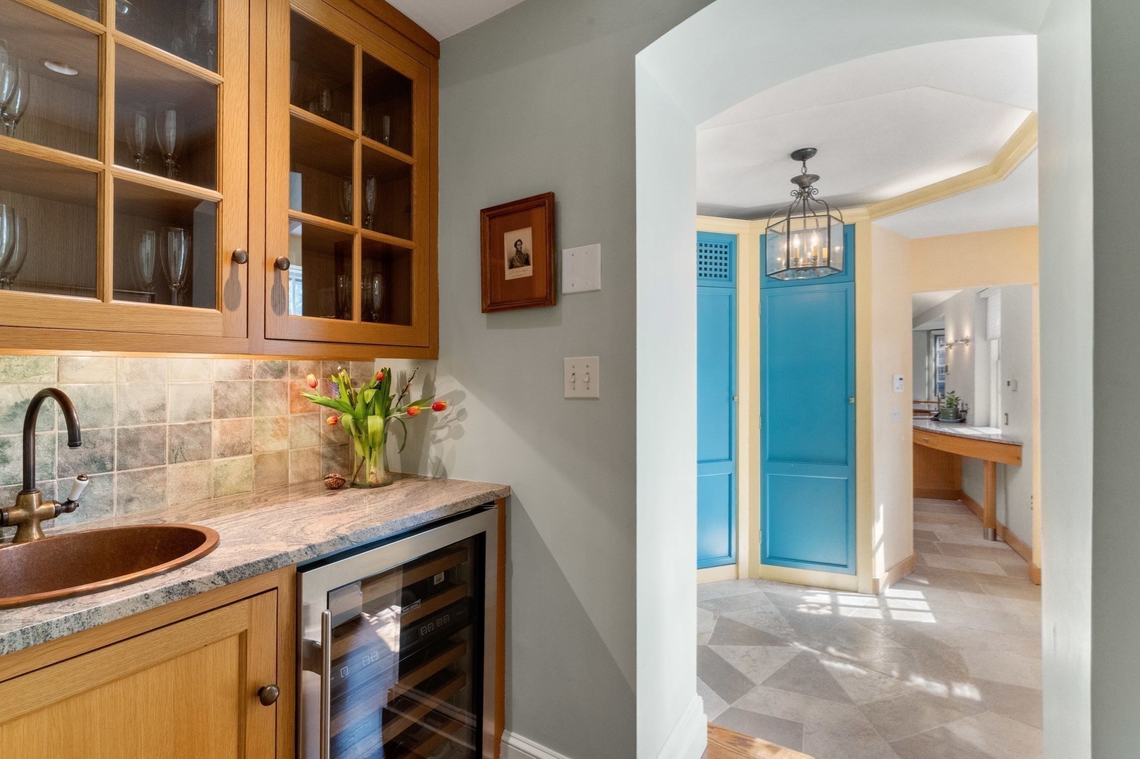 - Breakfast Bar / Nook, Closet/Cabinets - Custom Built, Countertops - Stone/Granite/Solid, Dining Area, Exterior Access, Flooring - Stone/Ceramic Tile, Gas Stove, Lighting - Overhead, Open Floor Plan, Pantry, Pot Filler Faucet, Skylight, Stainless Steel Appliances, Window(s) - Bay/Bow/Box