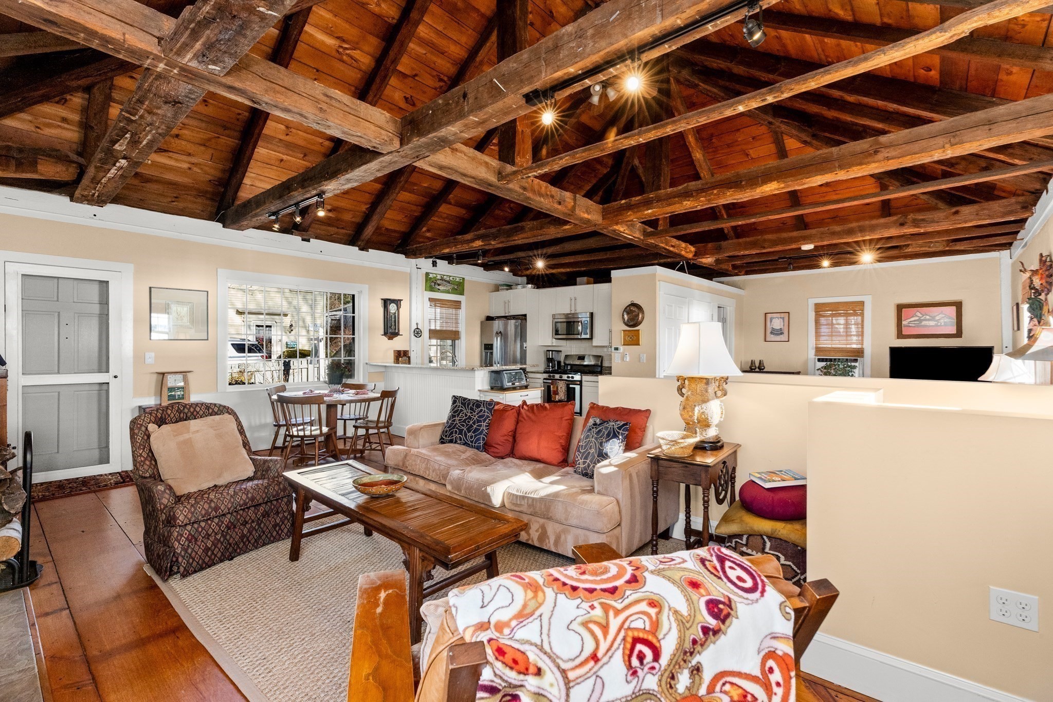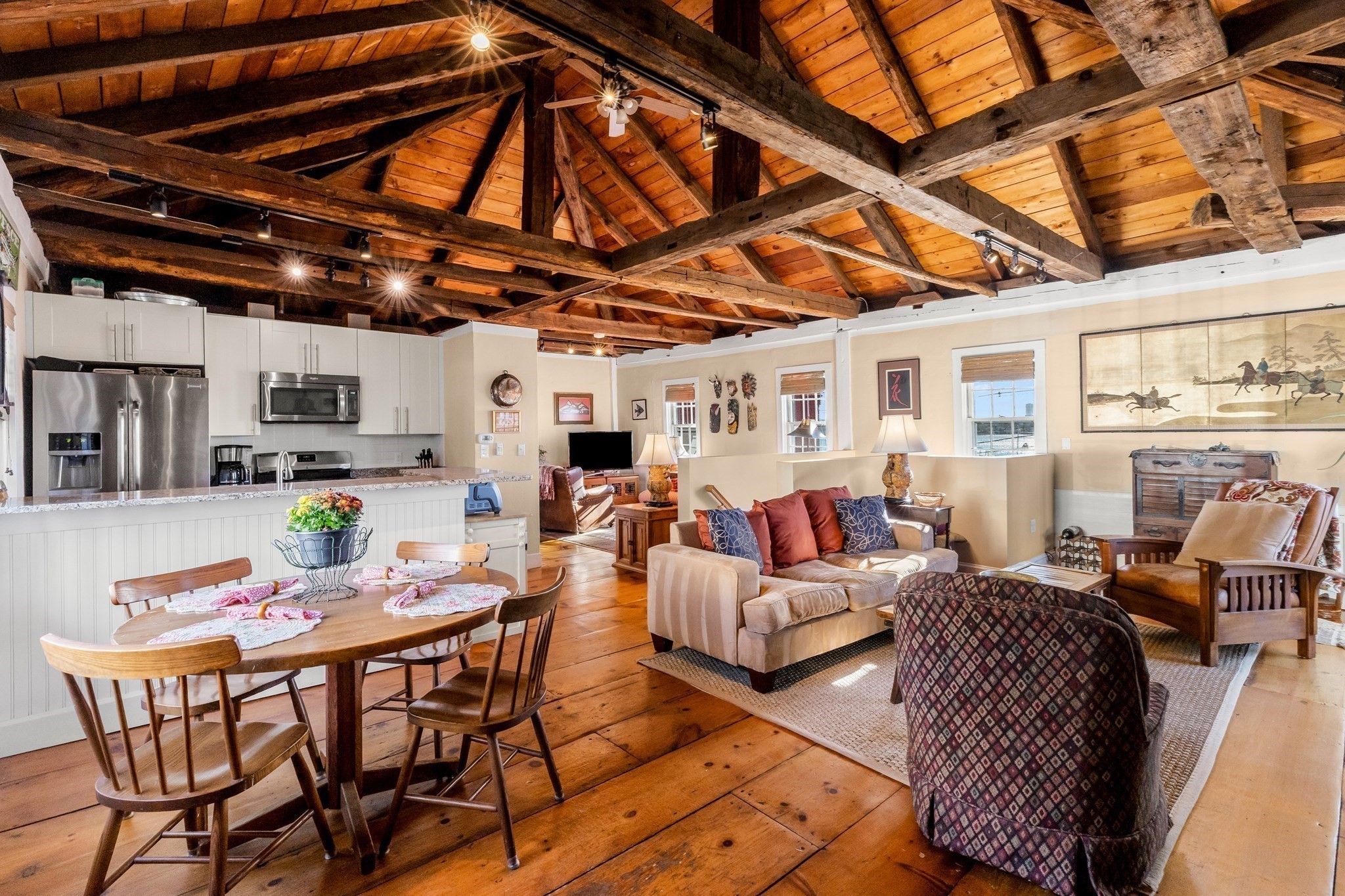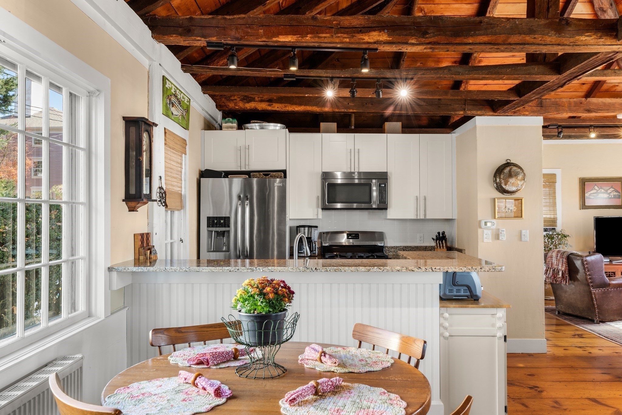 - Ceiling - Beamed, Ceiling - Vaulted, Countertops - Stone/Granite/Solid, Dining Area, Flooring - Hardwood, Kitchen Island