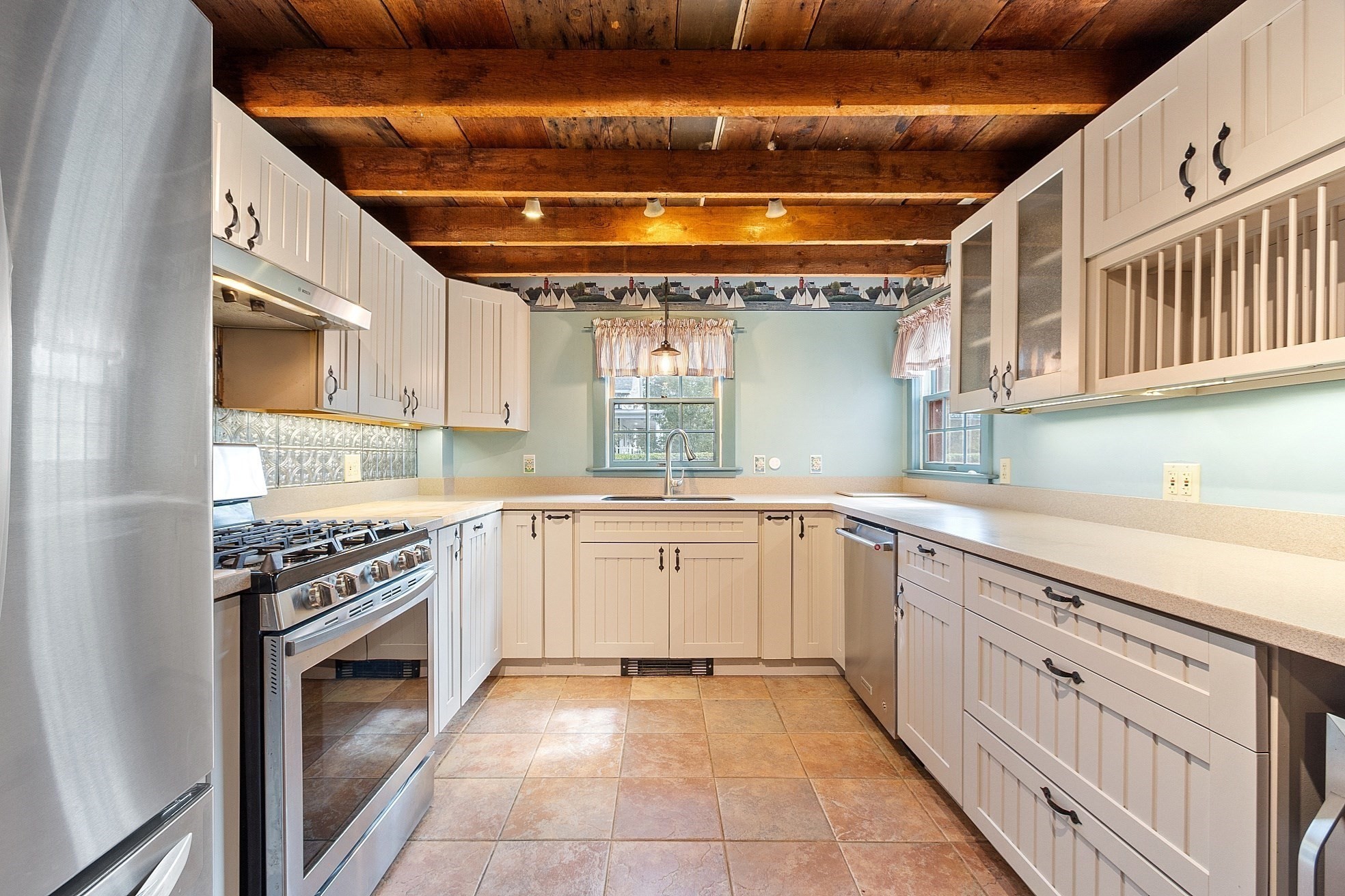 - Ceiling - Beamed, Closet/Cabinets - Custom Built, Countertops - Stone/Granite/Solid, Flooring - Stone/Ceramic Tile, Gas Stove, Lighting - Overhead, Window(s) - Bay/Bow/Box, Wine Chiller