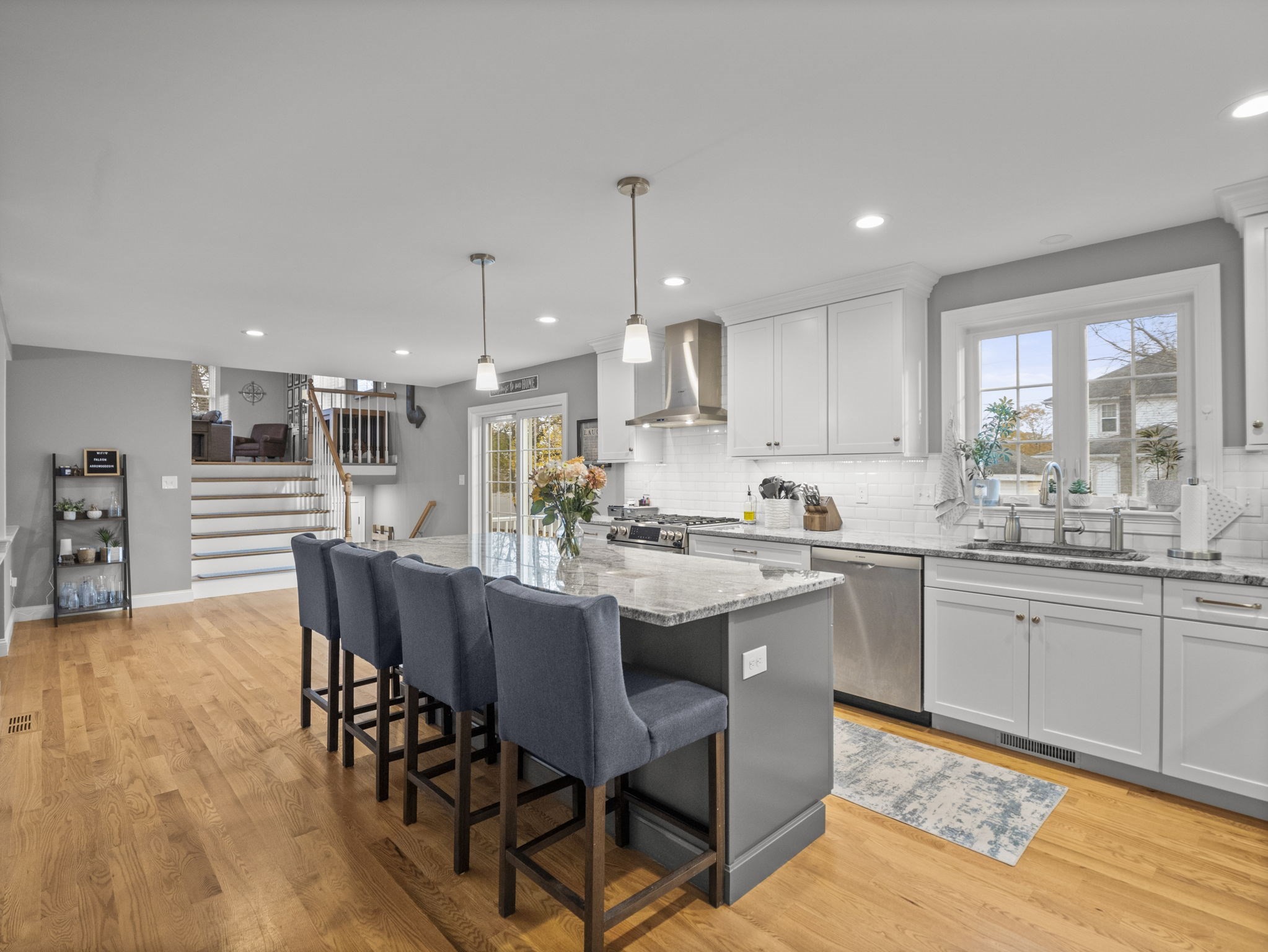 - Balcony / Deck, Countertops - Stone/Granite/Solid, Dining Area, Flooring - Hardwood, Kitchen Island, Lighting - Pendant, Recessed Lighting, Slider