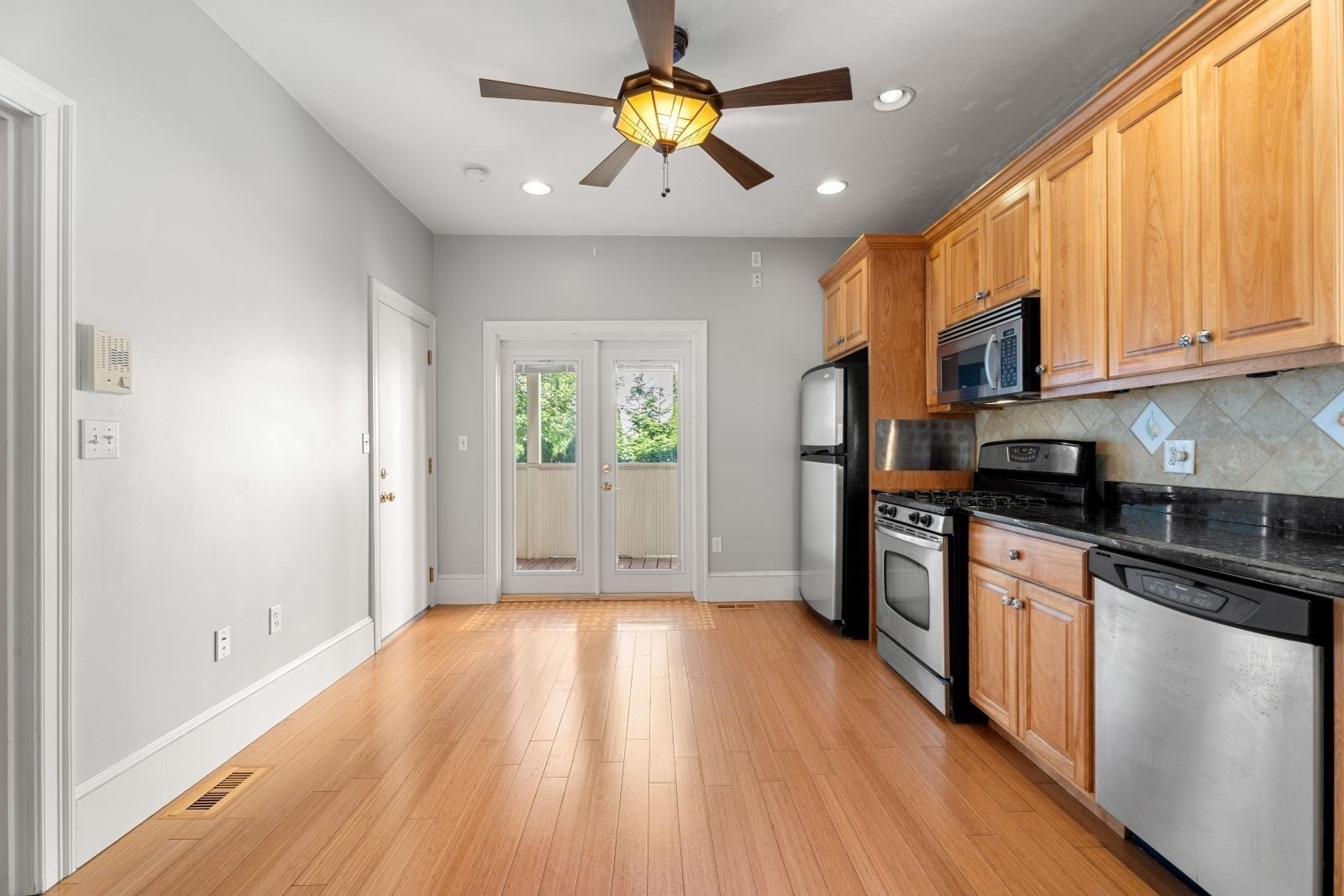 - Balcony / Deck, Ceiling Fan(s), Countertops - Stone/Granite/Solid, Dining Area, Flooring - Hardwood, French Doors, Pantry, Window(s) - Bay/Bow/Box