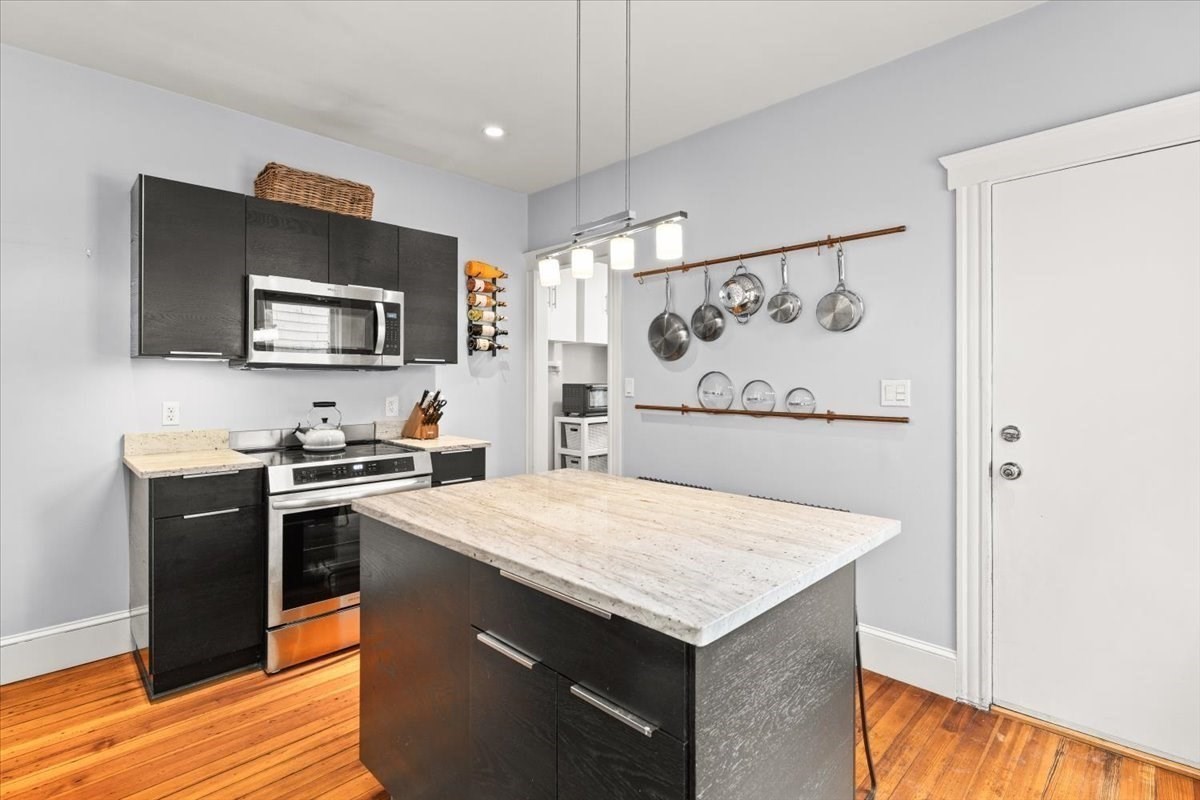 - Countertops - Stone/Granite/Solid, Exterior Access, Flooring - Hardwood, Kitchen Island, Lighting - Pendant, Recessed Lighting, Remodeled, Stainless Steel Appliances