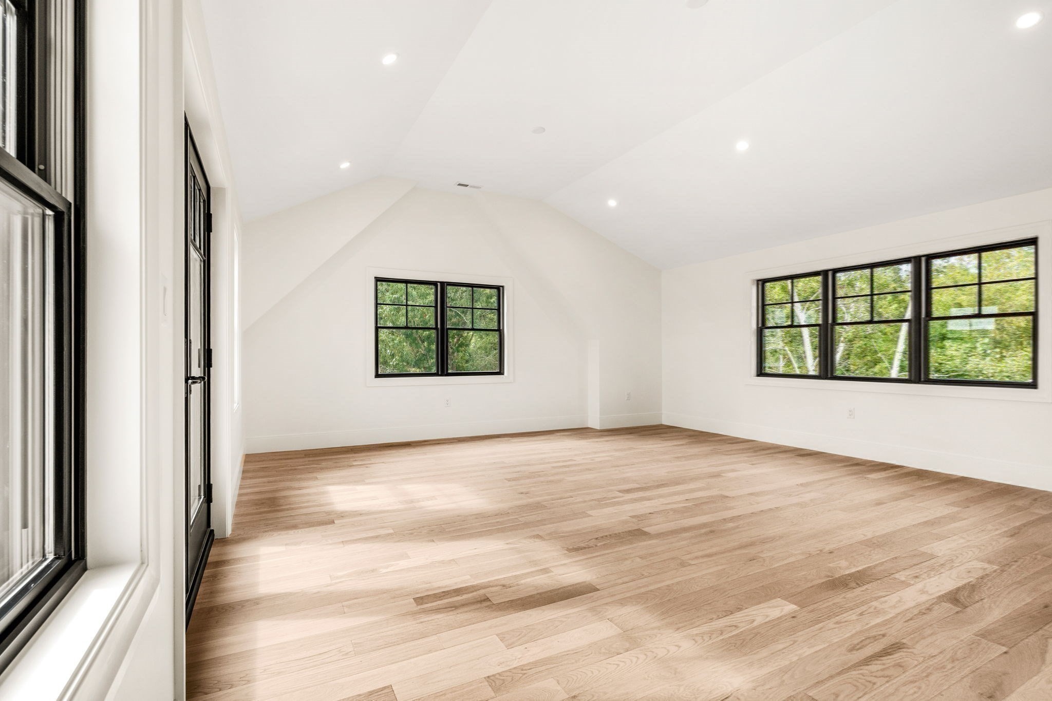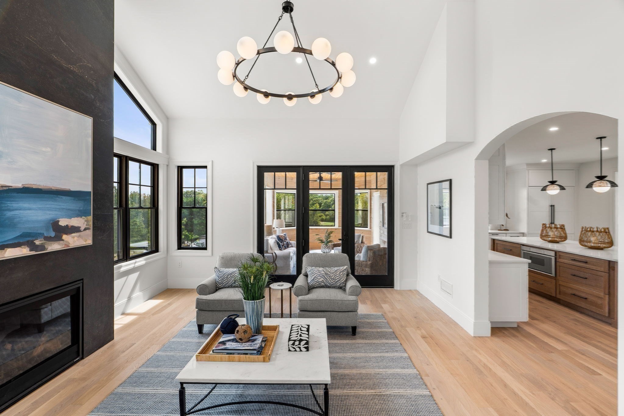 - Living Room Features: Ceiling - Cathedral, Deck - Exterior, Exterior Access, Fireplace, Flooring - Engineered Hardwood, French Doors, Recessed Lighting