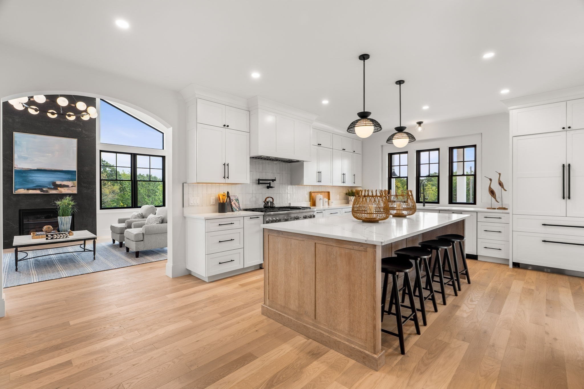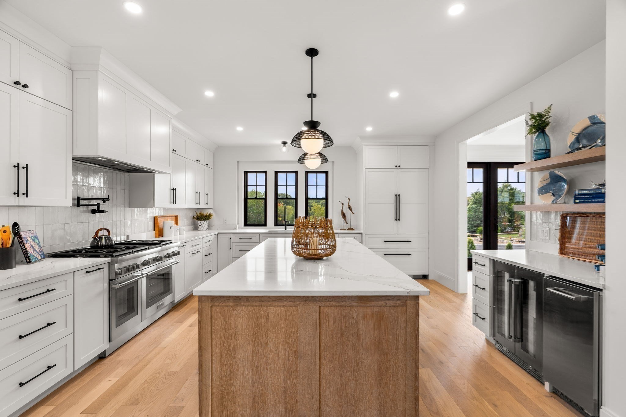 - Cabinets - Upgraded, Countertops - Stone/Granite/Solid, Flooring - Engineered Hardwood, Flooring - Hardwood, Gas Stove, High Speed Internet Hookup, Kitchen Island, Lighting - Overhead, Open Floor Plan, Pantry, Pot Filler Faucet, Recessed Lighting, Stainless Steel Appliances, Walk-in Storage, Wet bar, Wine Chiller