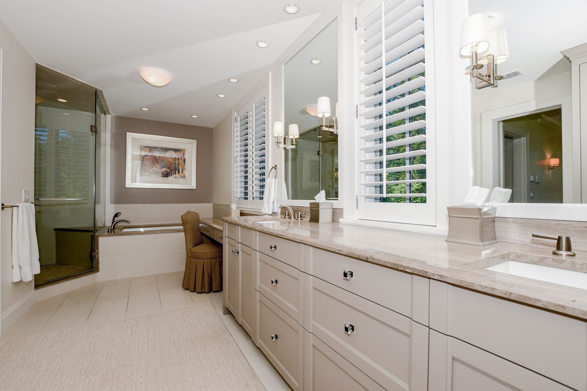 - Bathroom 1 Features: Bathroom - Double Vanity/Sink, Bathroom - Full, Bathroom - Tiled With Tub & Shower, Closet - Walk-in, Closet/Cabinets - Custom Built, Countertops - Stone/Granite/Solid, Flooring - Stone/Ceramic Tile, Lighting - Sconce, Recessed Lighting