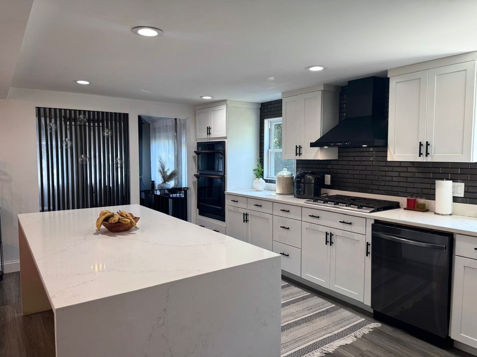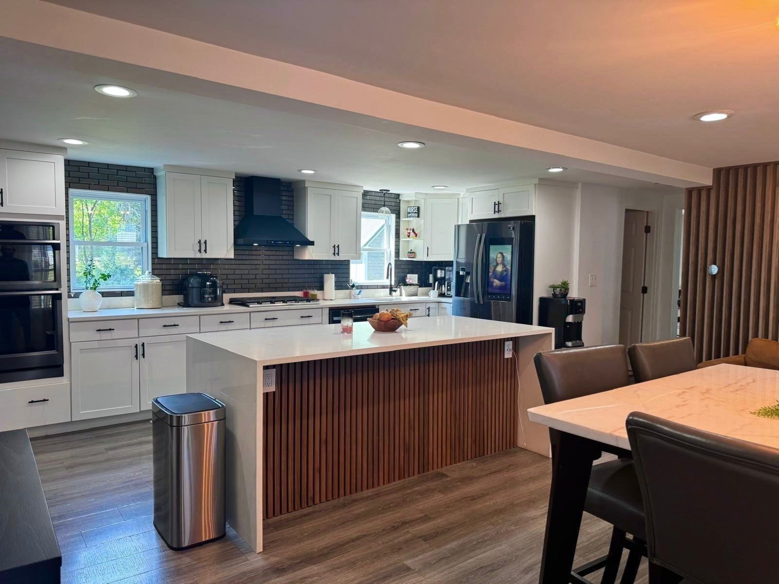 - Flooring - Laminate, Gas Stove, Kitchen Island, Open Floor Plan, Recessed Lighting, Stainless Steel Appliances