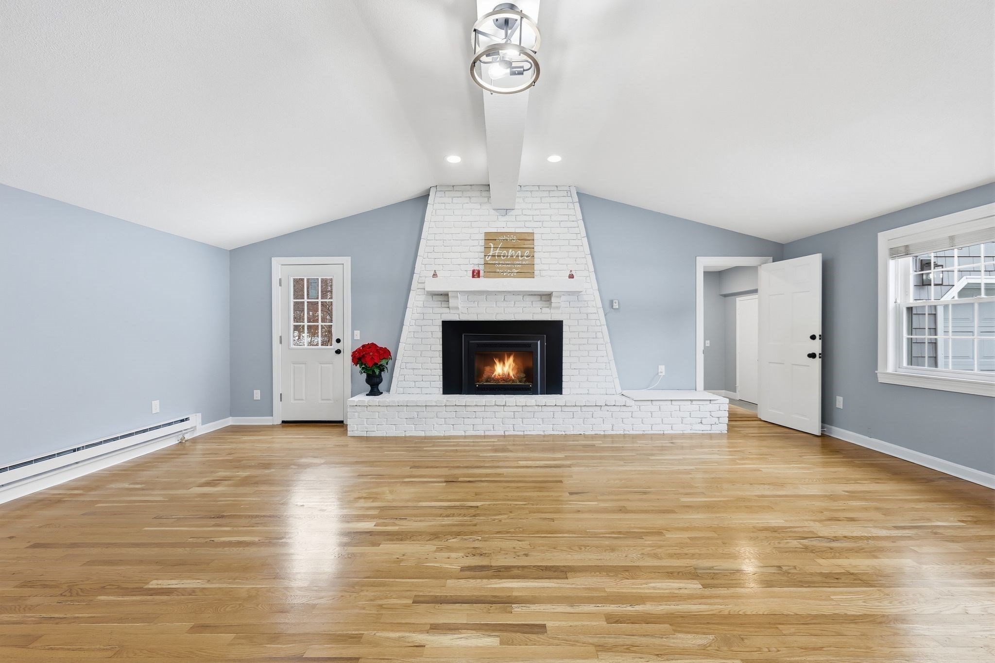 - Living Room Features: Cable Hookup, Ceiling - Beamed, Ceiling - Cathedral, Closet, Deck - Exterior, Exterior Access, Fireplace, Flooring - Hardwood, Lighting - Pendant, Recessed Lighting, Remodeled