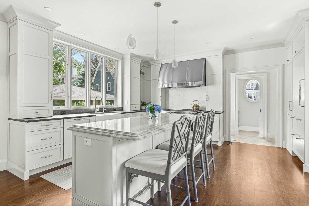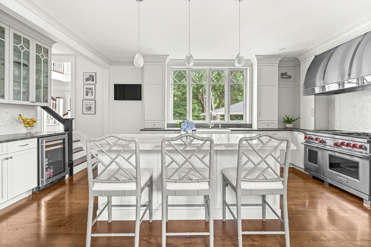 - Balcony / Deck, Bathroom - Half, Cabinets - Upgraded, Closet/Cabinets - Custom Built, Countertops - Stone/Granite/Solid, Countertops - Upgraded, Crown Molding, Deck - Exterior, Exterior Access, Flooring - Hardwood, French Doors, Gas Stove, Kitchen Island, Lighting - Pendant, Recessed Lighting, Remodeled, Stainless Steel Appliances, Wet bar, Wine Chiller