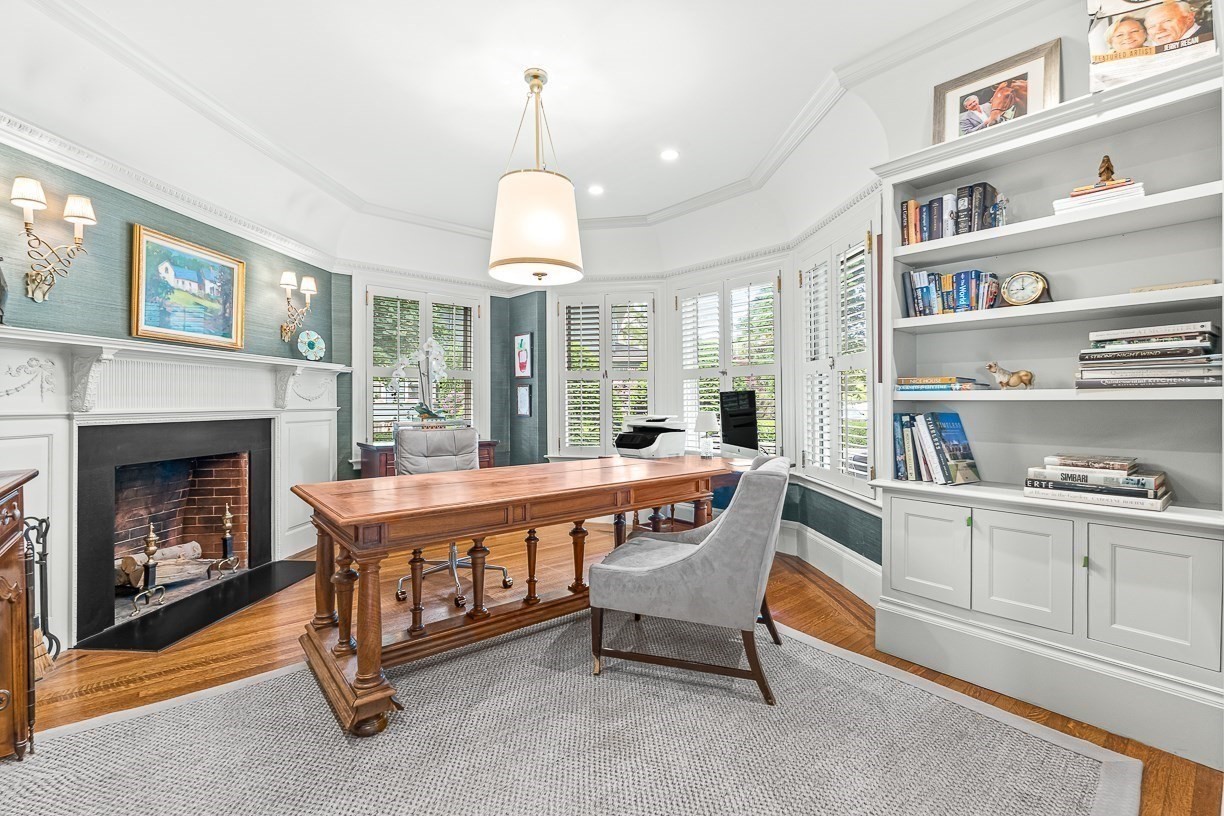 - Dining Room Features: Ceiling - Beamed, Crown Molding, Decorative Molding, Fireplace, Flooring - Hardwood, Lighting - Overhead, Lighting - Sconce, Recessed Lighting, Window(s) - Bay/Bow/Box
