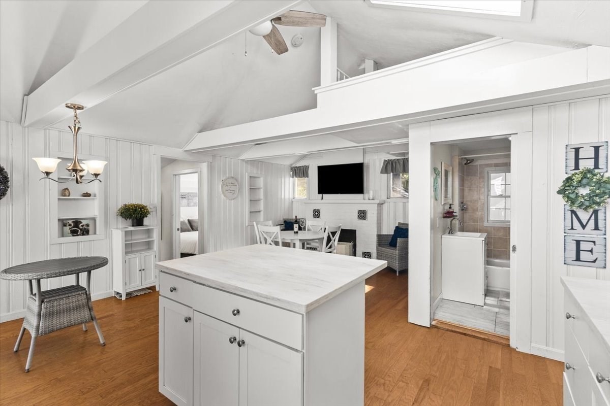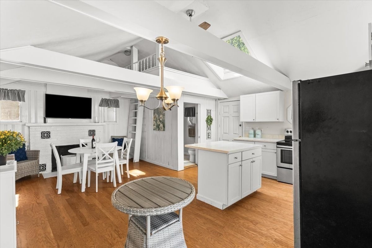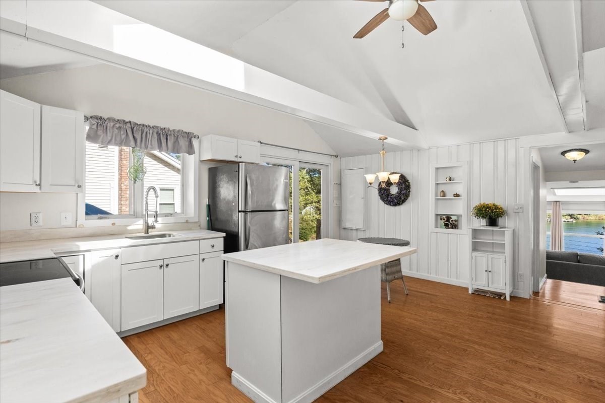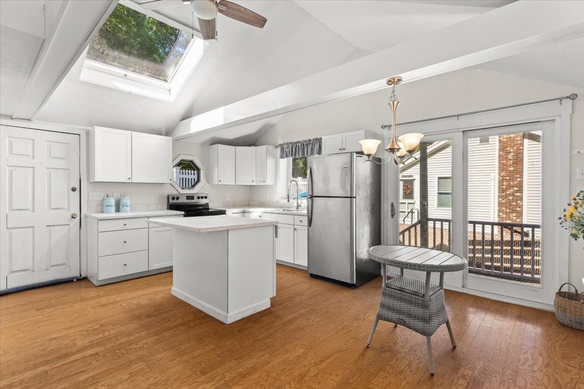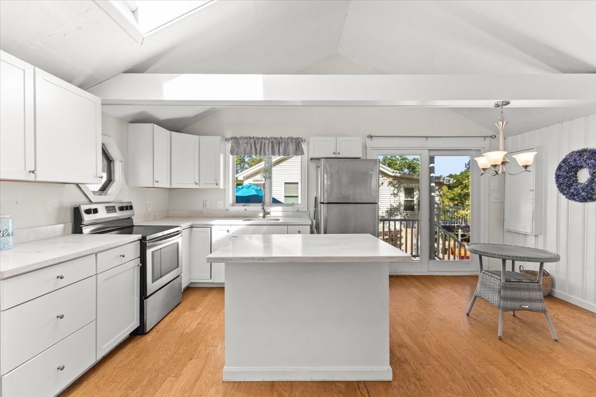 - Cabinets - Upgraded, Ceiling - Cathedral, Ceiling Fan(s), Deck - Exterior, Dining Area, Exterior Access, Flooring - Laminate, Kitchen Island, Skylight, Stainless Steel Appliances
