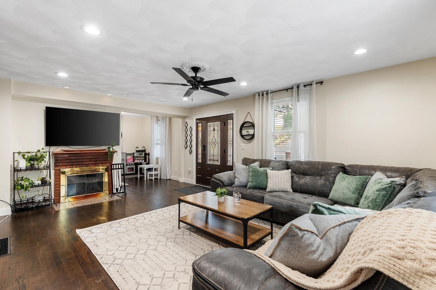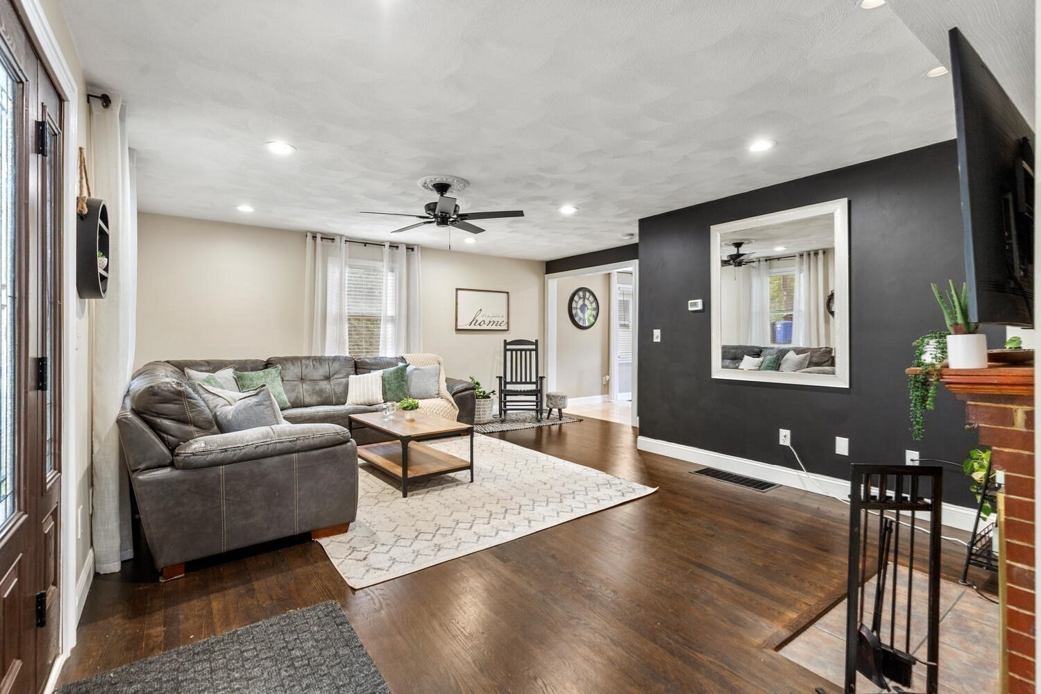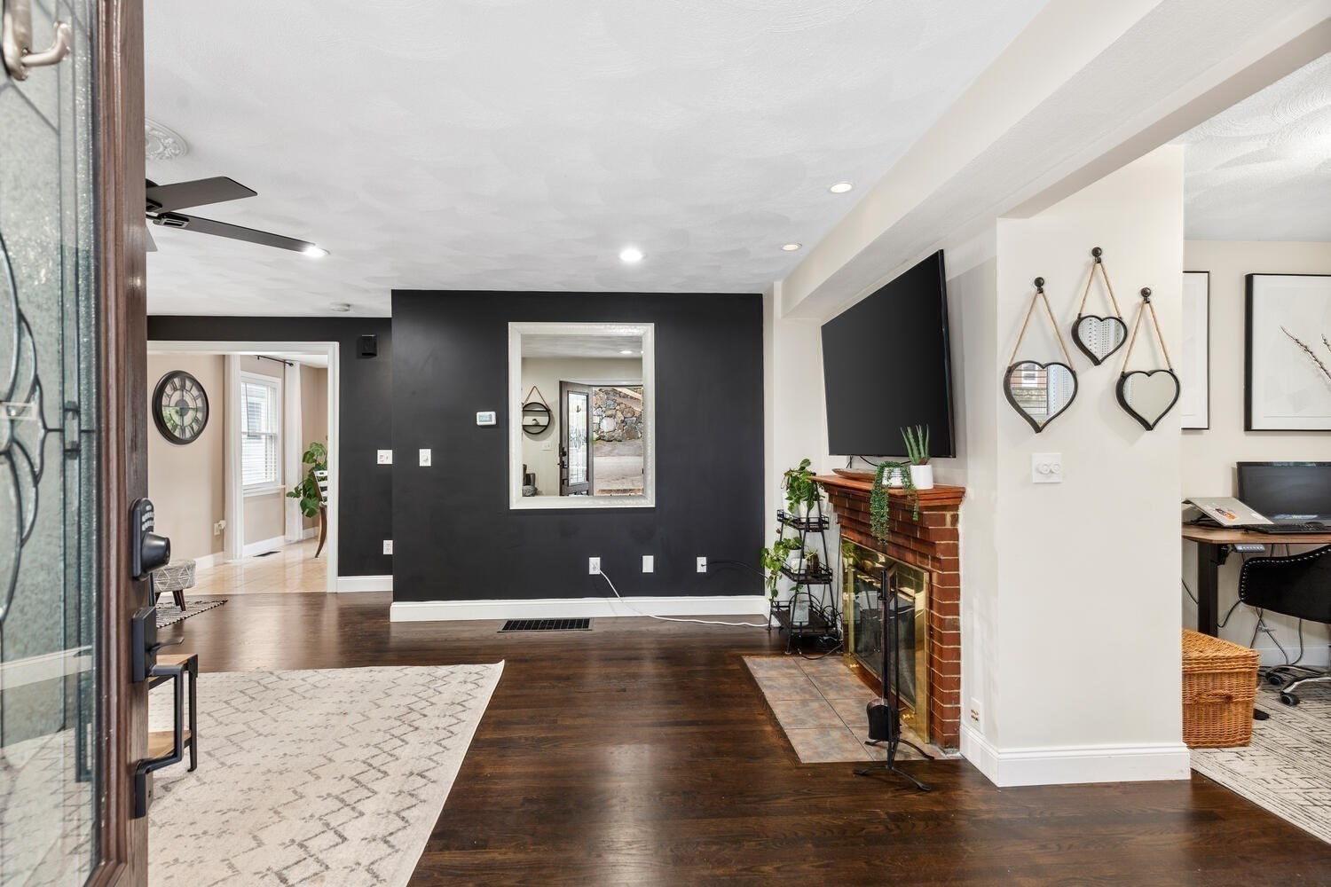 - Living Room Features: Ceiling Fan(s), Fireplace, Flooring - Wood