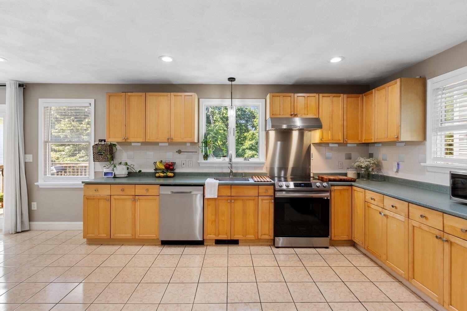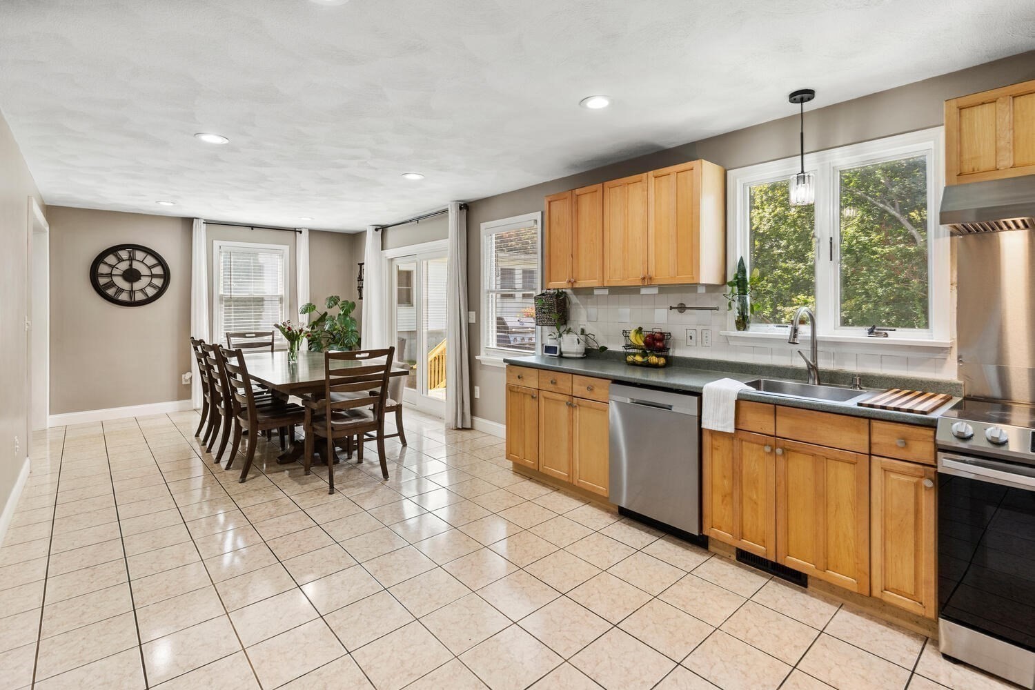- Exterior Access, Flooring - Stone/Ceramic Tile, Lighting - Pendant, Open Floor Plan, Pantry, Recessed Lighting, Slider, Stainless Steel Appliances